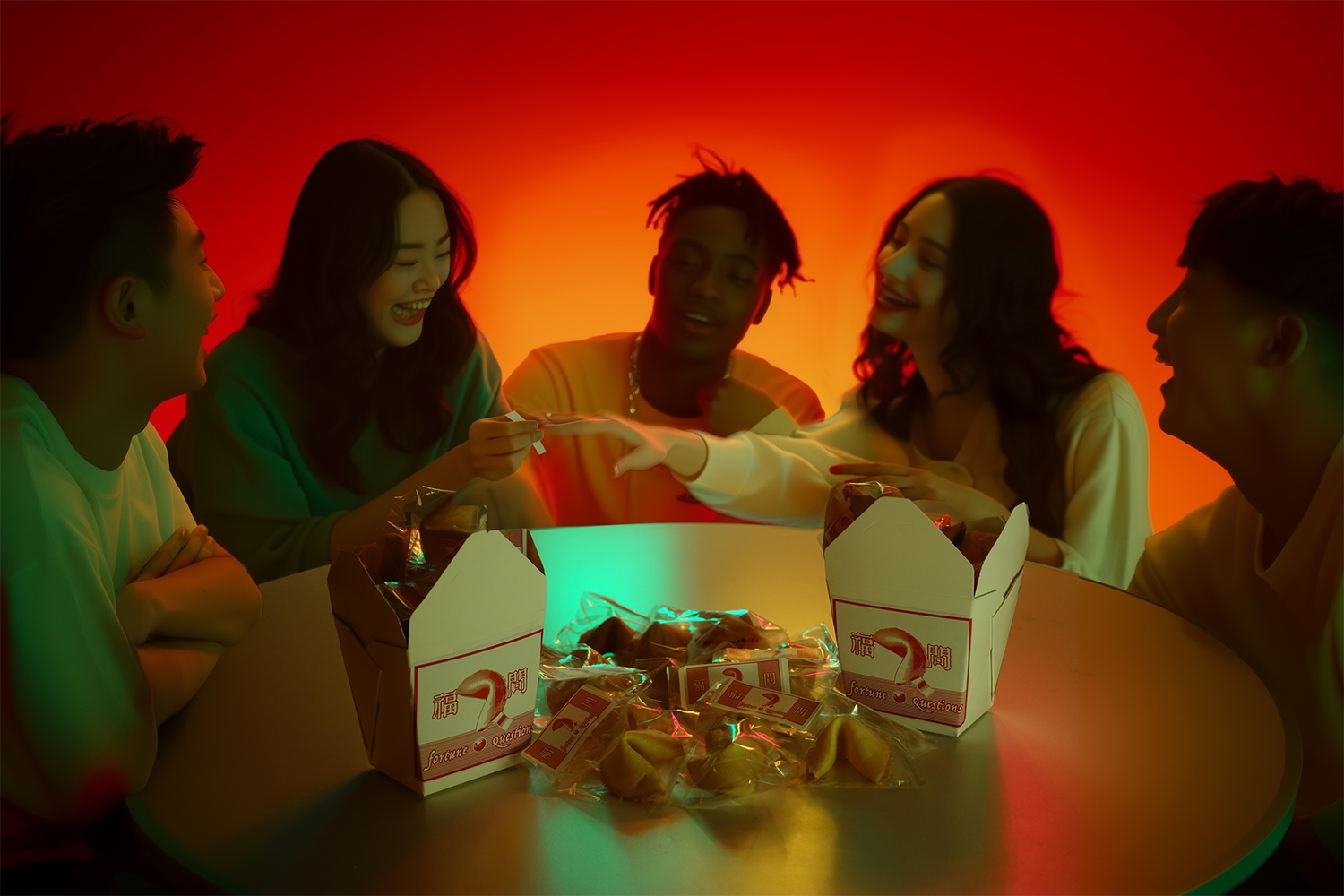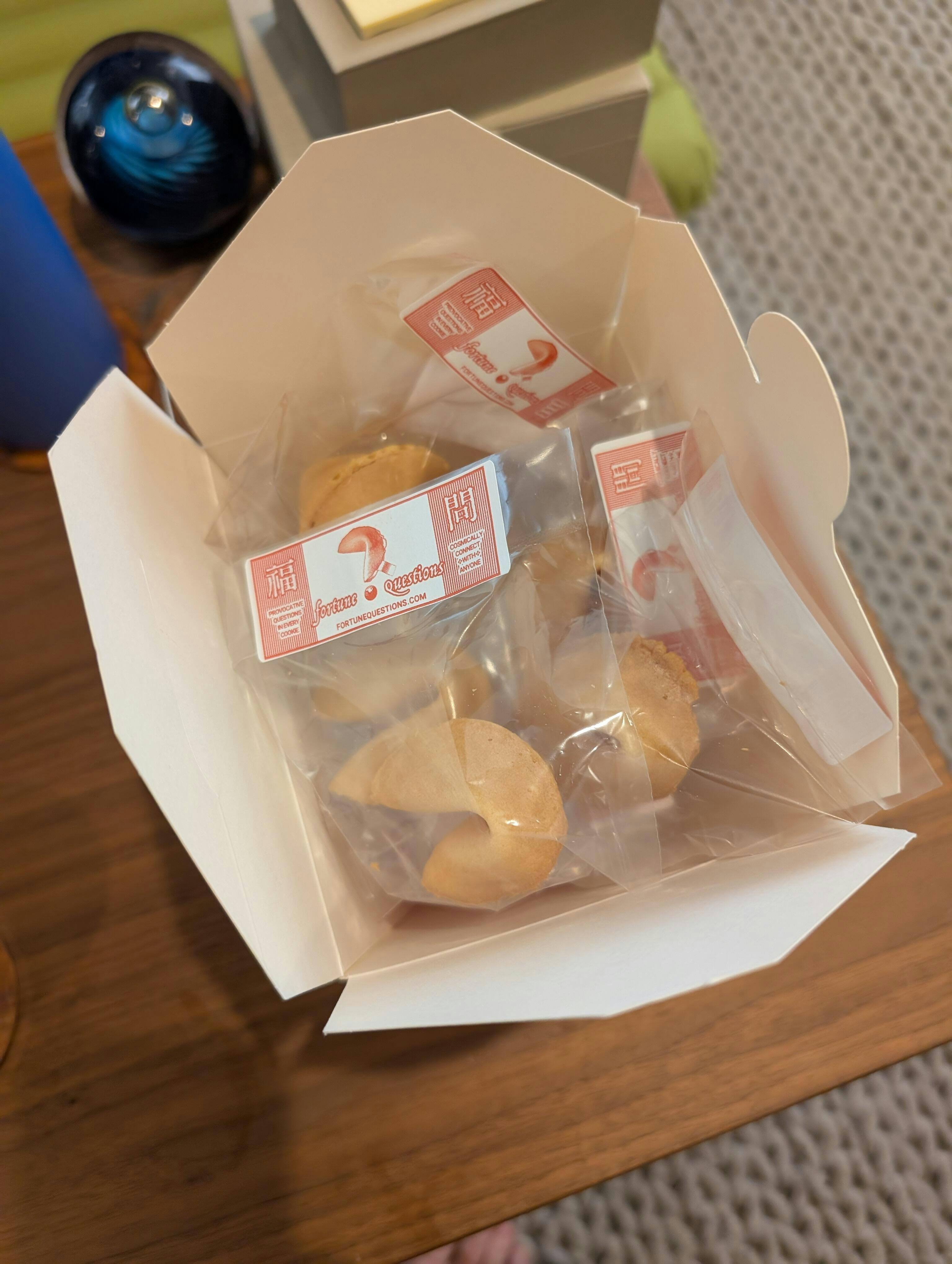 Our Signature Batch of individually-wrapped fortune cookies – each with an introspective, thought-provoking question tucked inside.